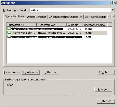 Im folgenden wird davon ausgegangen, dass ein entsprechendes Zertifikat im ZS vorliegt. Man öffne nun Selbigen im Internet Explorer -> Internetoptionen -> Inhalte -> Zertifikate und wählt das Zertifikat und klickt auf Exportieren
